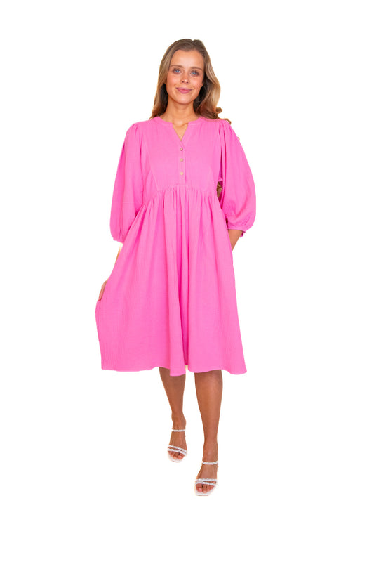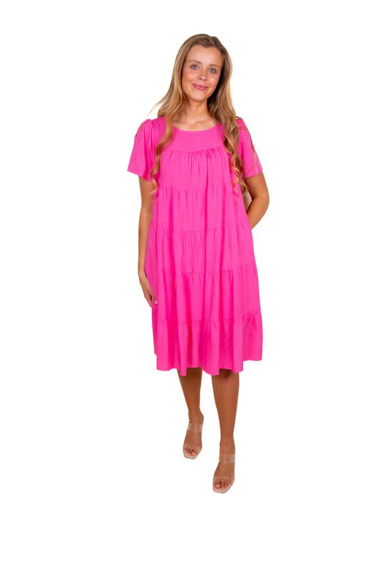 RESTOCKED - The Bella Babydoll Dress with Pockets in Hot Pink