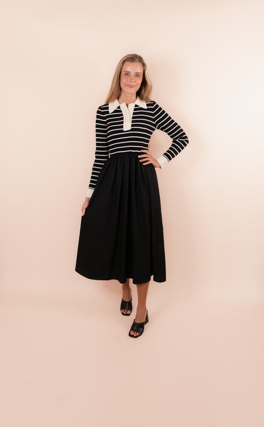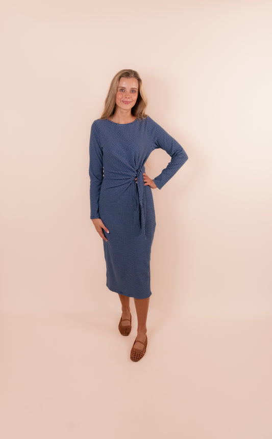 The Addie Ribbed Knit Midi Dress in Navy Stripes