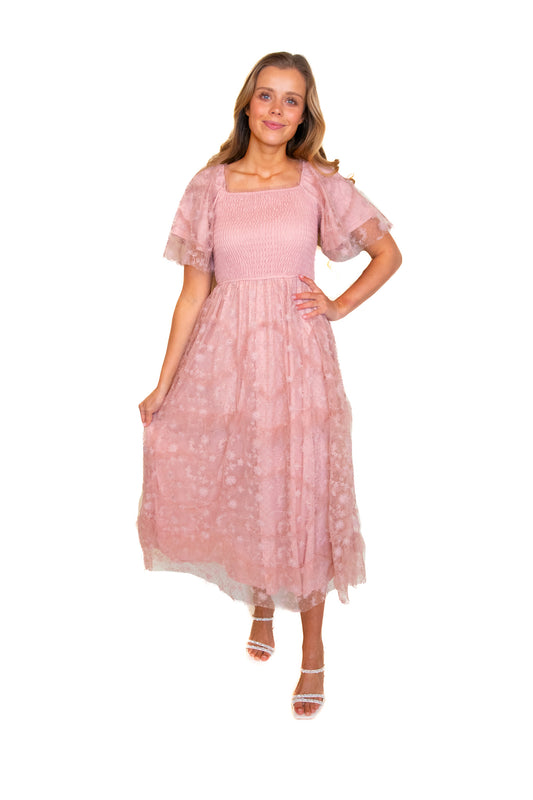 The Aria Embroidered Smocked Midi in Pink