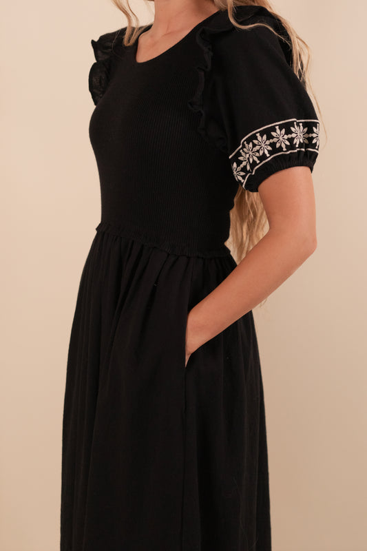 The Amelia Embroidered Knit Midi Dress in Black