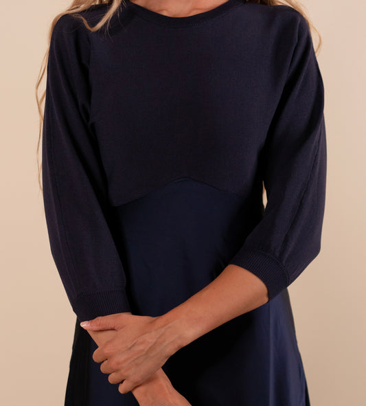 The Avery Satin Sweater Dress in Deep Navy