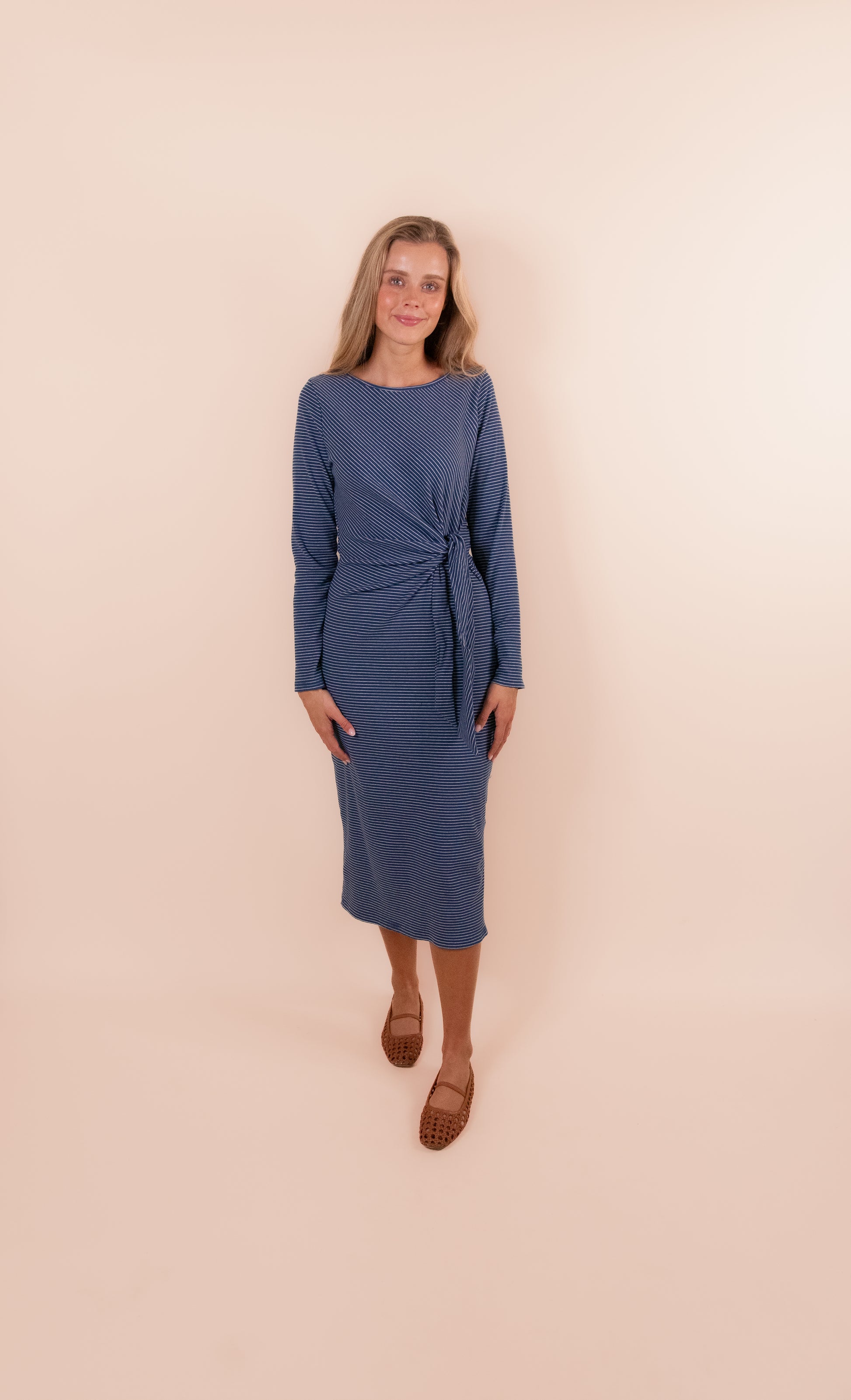 The Addie Ribbed Knit Midi Dress in Navy Stripes is crafted from soft, brushed ribbed knit fabric that offers comfortable stretch and a flattering fit. Featuring a side slit for easy movement and a customizable waist tie detail, this dress adapts seamlessly from casual days to dressed-up evenings. A versatile fall staple you'll reach for again and again.