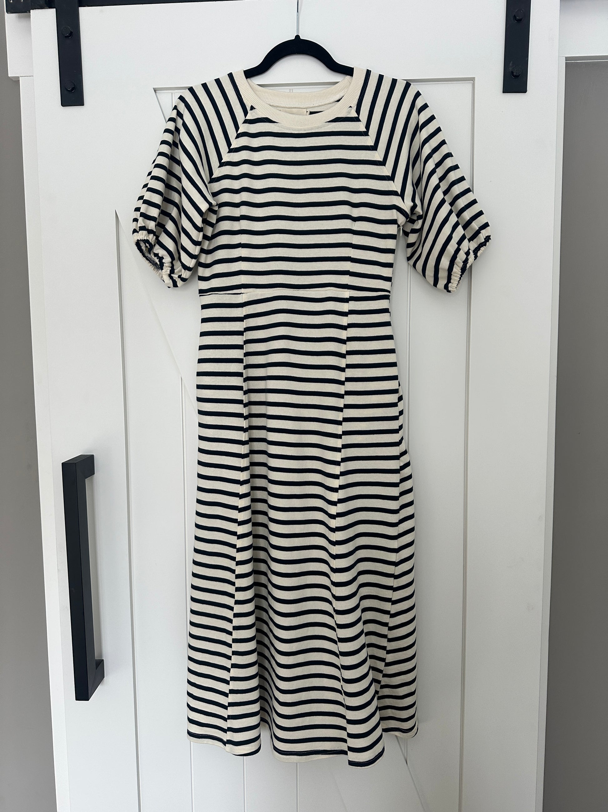 Elevate your everyday style with The Hayden Cotton Sweatshirt Dress in Red Stripes. This versatile midi dress features a flattering around-the-neck neckline and charming puff sleeves that add dimension and movement. Crafted from soft cotton, it's perfect for layering or wearing solo. Practical hidden pockets keep your essentials within reach while you move through your day. Whether you're heading to brunch or running errands, this dress delivers comfort without compromising on style.
