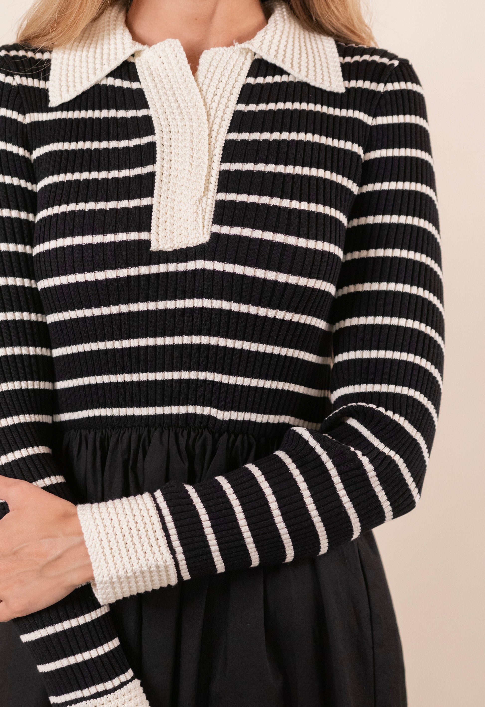 The Juliet Striped Sweater Dress effortlessly blends cozy knitwear with chic midi styling. Featuring a collared V-neckline and long sleeves, its mixed media design pairs a soft sweater knit top with a woven skirt. The A-line silhouette is enhanced by striking stripe pattern contrast details, creating a sophisticated yet comfortable look. Perfect for transitioning through seasons, this dress offers both warmth and style in one versatile piece.