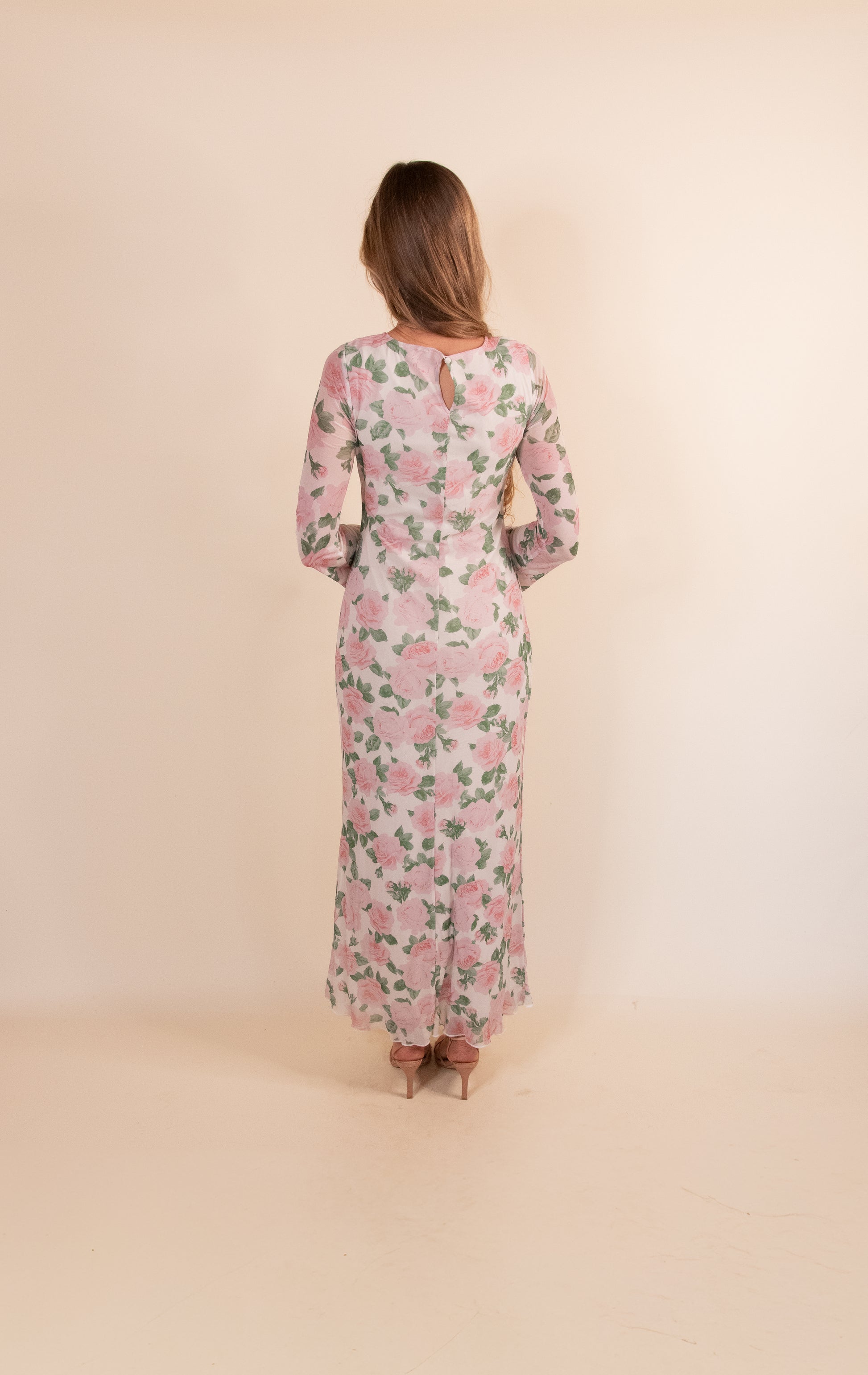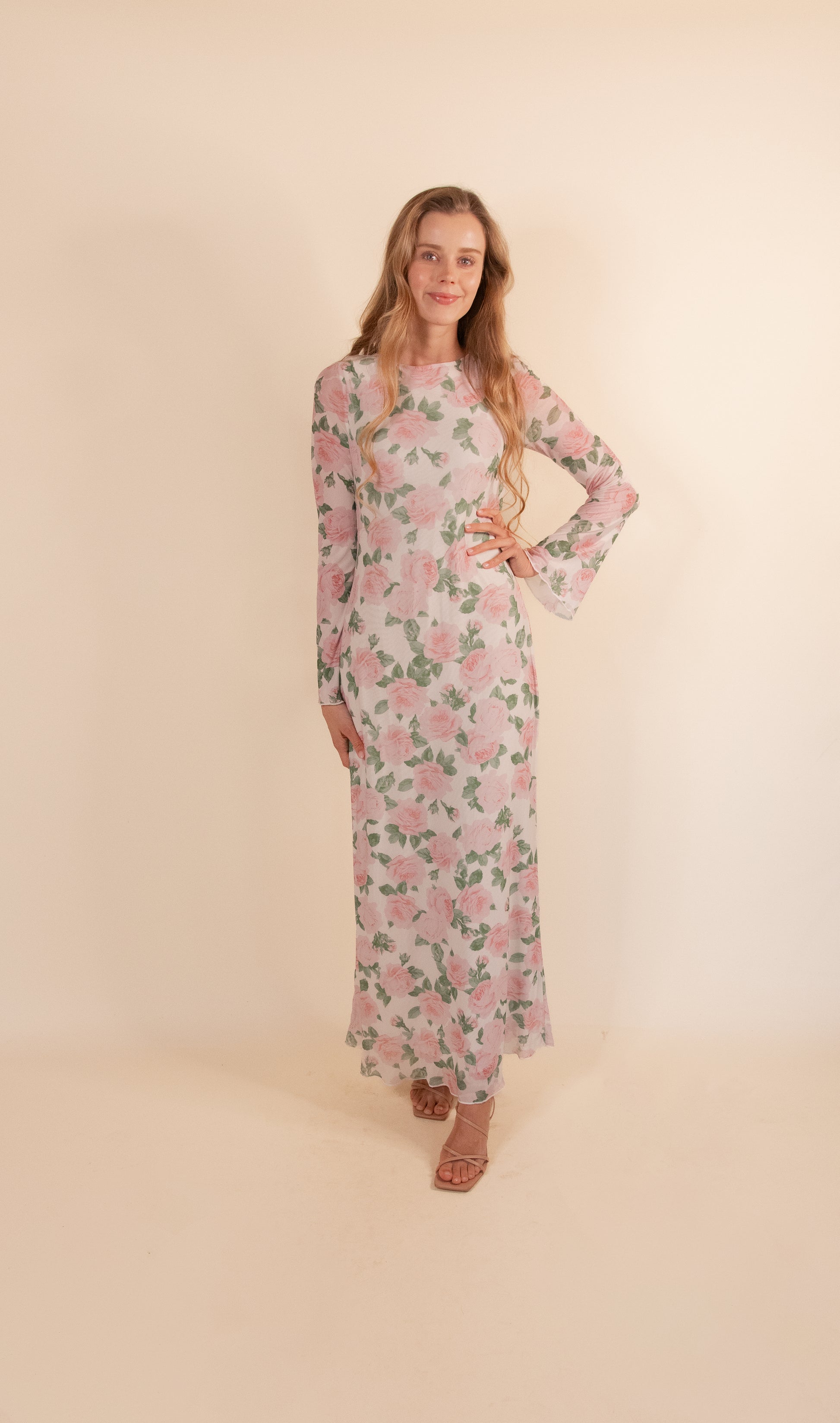 The Lola Mesh Maxi in Rose Floral features a delicate custom floral print on sheer mesh fabric, creating an effortlessly romantic look. Its long bell sleeves add a graceful touch, while the keyhole back offers subtle allure. The lined bodice ensures comfort and coverage, contrasting beautifully with the unlined, airy sleeves. Falling to a flattering maxi length, this dress is perfect for making a memorable statement at any special occasion.
