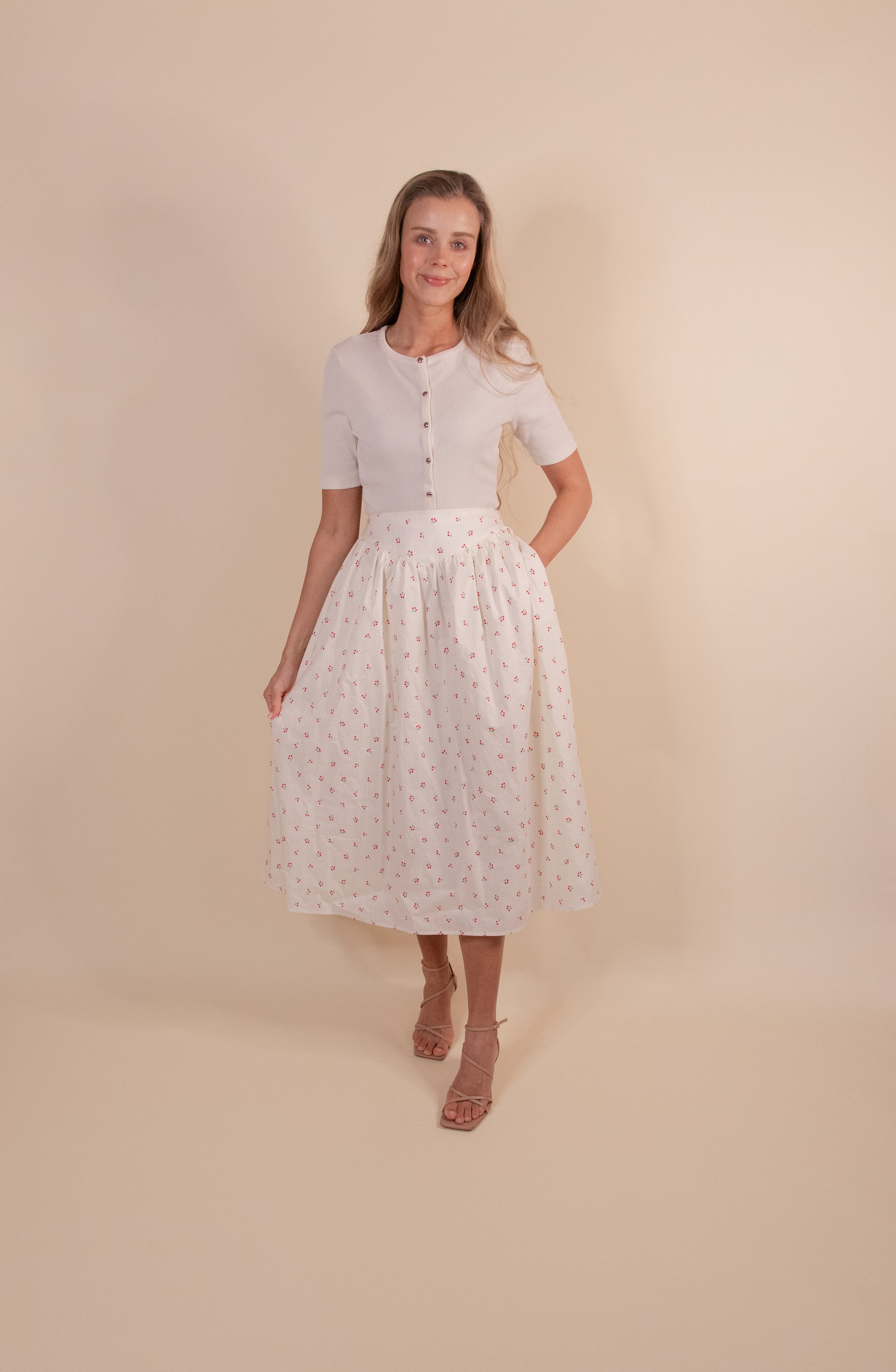 Discover effortless sophistication with this cotton cherry-print midi skirt, crafted to flatter and function. The sculpted basque waist defines your silhouette beautifully, while hidden side pockets offer practical convenience. A smooth side zipper glides open with ease, and the fully lined interior ensures comfort all day long. The vibrant cherry print brings a fresh, feminine touch to any outfit.Â