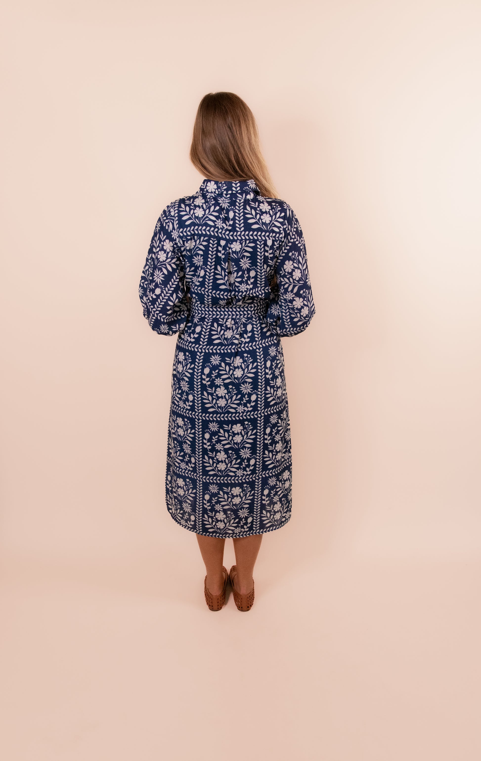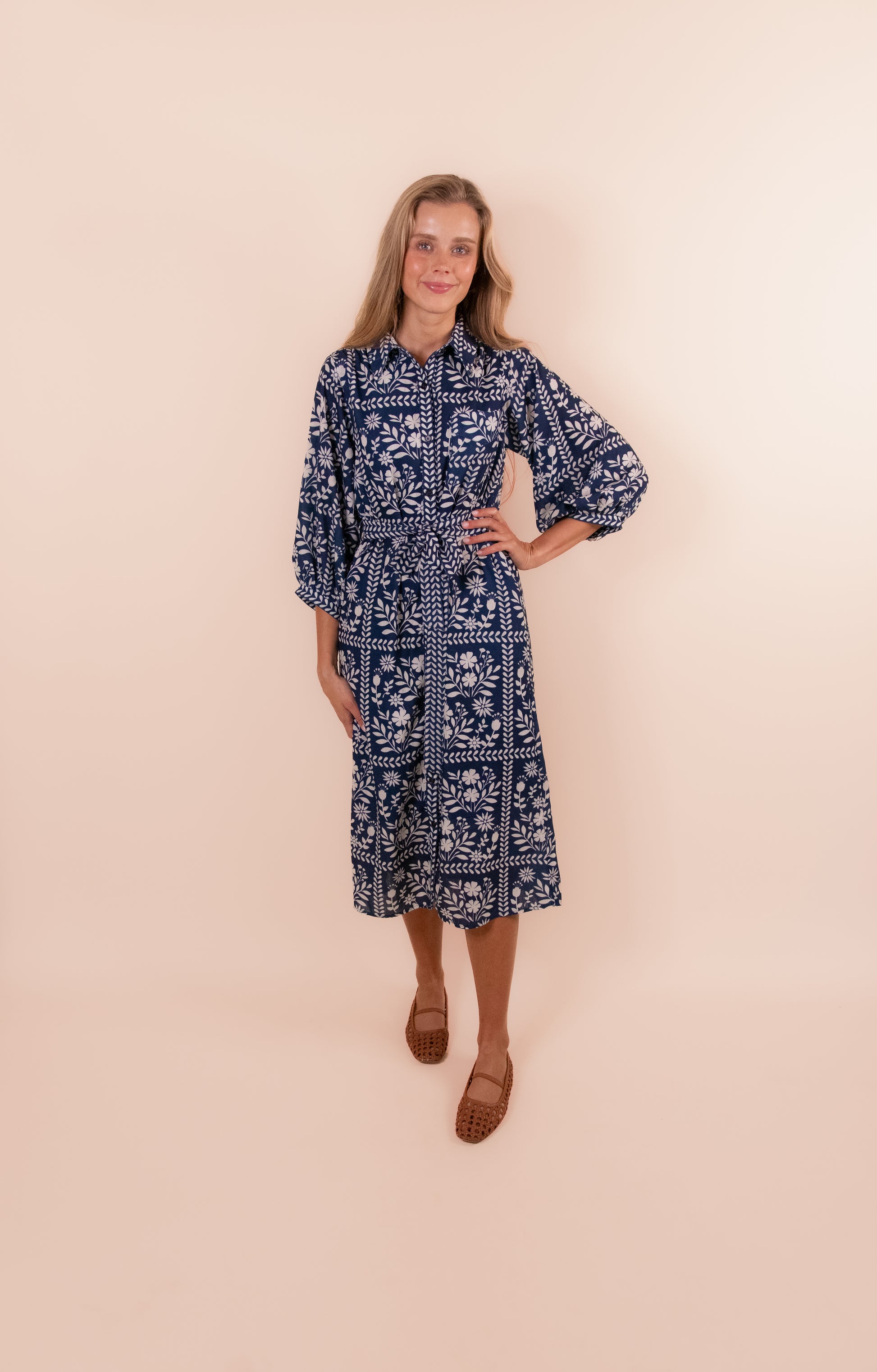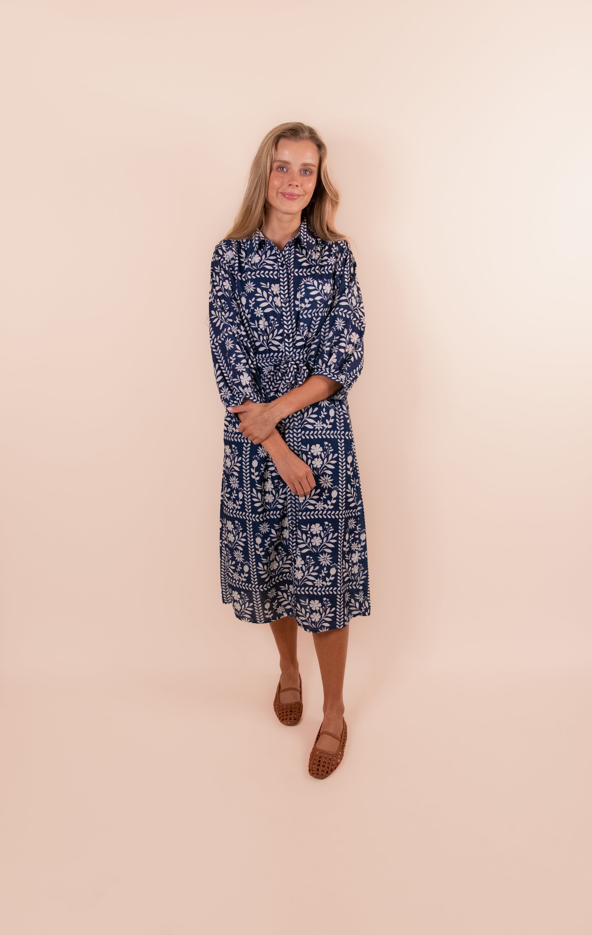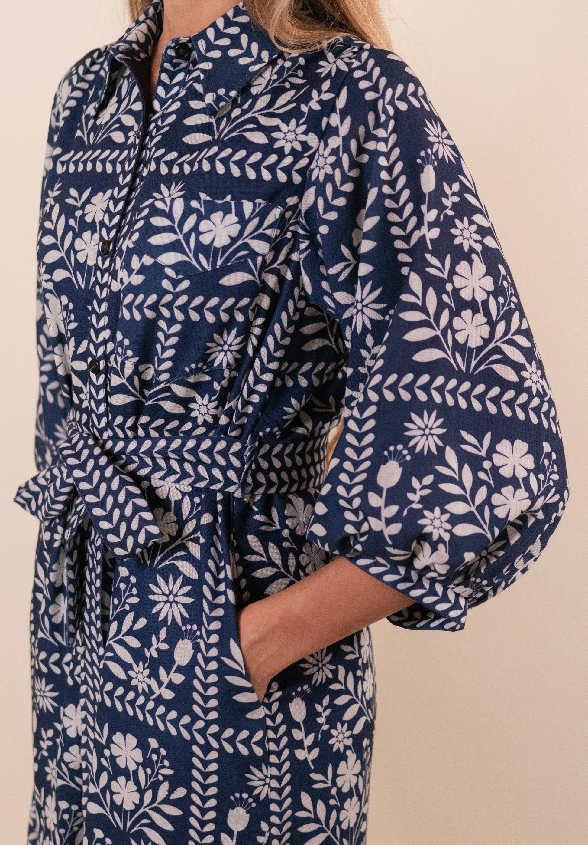 The Rhen Shirt Dress in Navy Floral is a beautifully crafted midi dress featuring a vibrant leaf and floral print. Its button-down design combined with a removable tie belt allows for a customizable and flattering fit. Made from thick, fully lined fabric, this dress offers comfortable coverage and a polished silhouette perfect for any occasion.