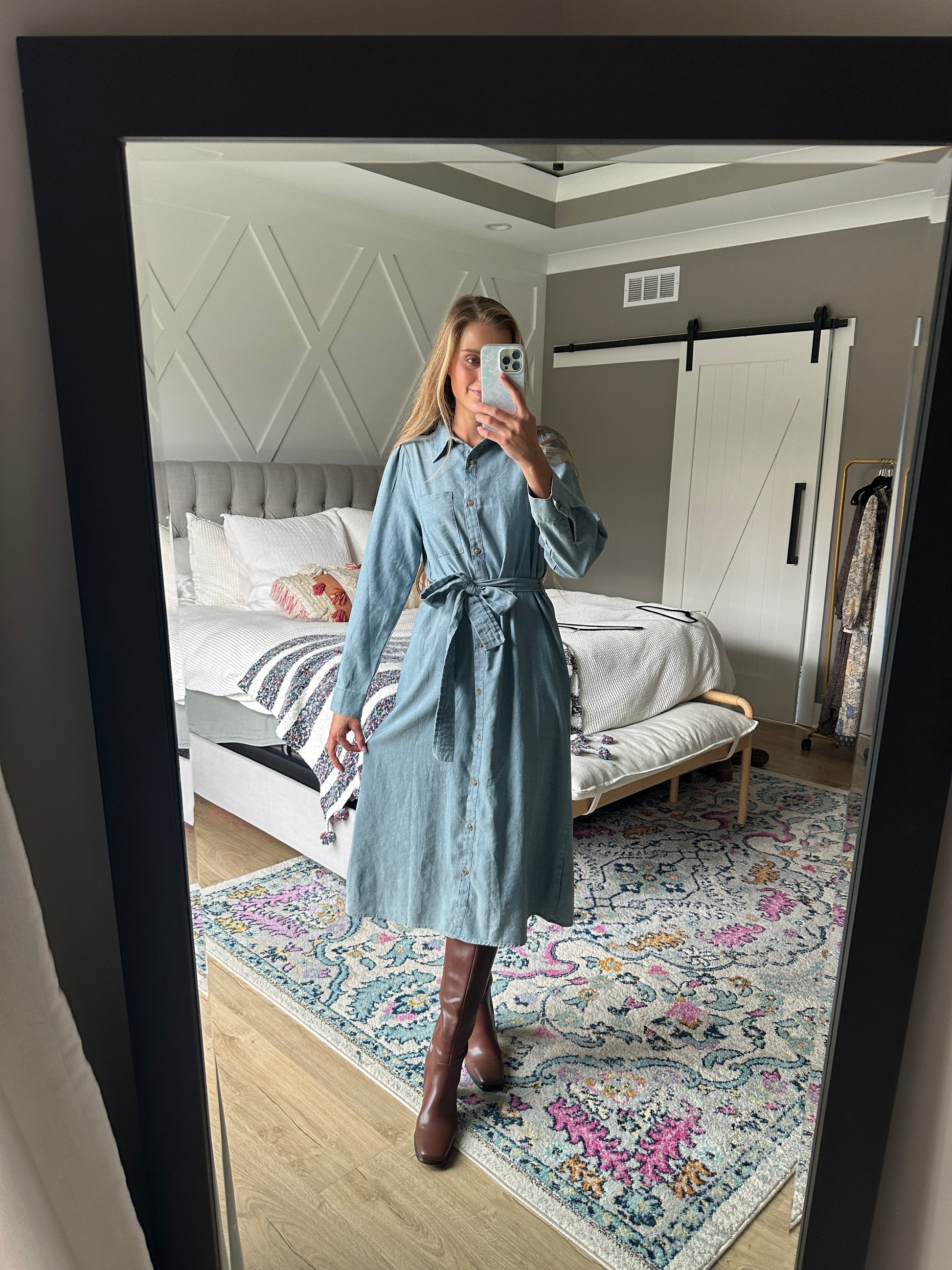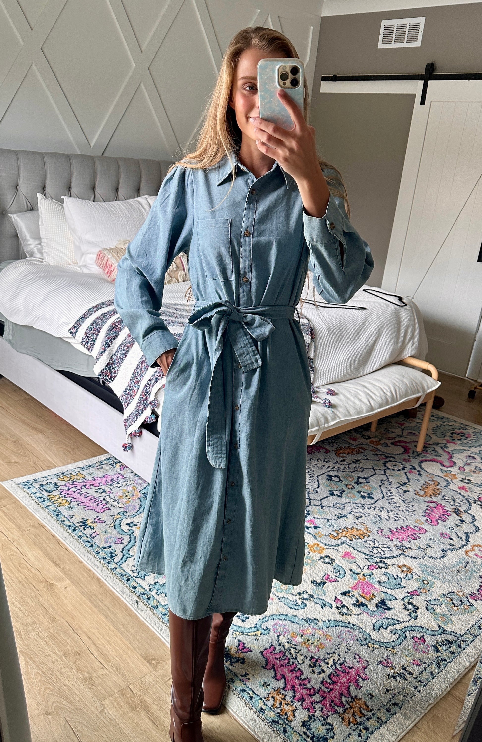 The Allison Chambray Shirt Dress effortlessly transitions from casual to polished with its timeless lightweight chambray construction. Designed with practical pockets and a flattering silhouette, this versatile piece layers beautifully over tees or stands alone as a refined dress. Whether you're dressing it down with sneakers or elevating it with heels and accessories, The Allison adapts to your style. Its classic appeal makes it the perfect wardrobe staple that works harder than you'd expect, season after season.