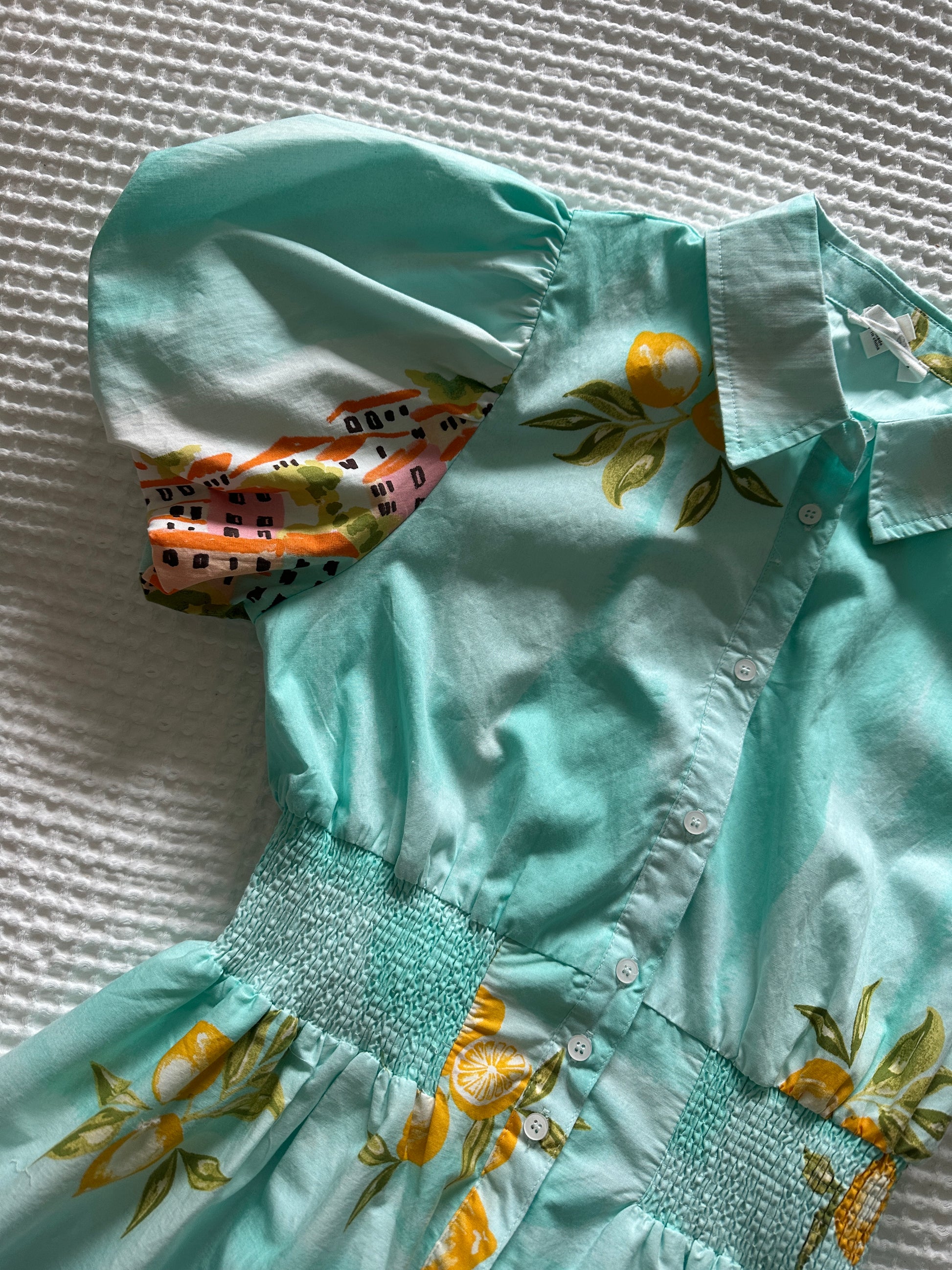 The Amalfi Midi Dress brings  timeless charm with its exclusive landscape print and thoughtfully designed details. This collared button-down features a full button placket for easy styling, paired with delicate bubble sleeves that add a touch of elegance. The smocked elastic waist provides a flattering, comfortable fit, while functional pockets offer everyday practicality. Fully lined for a polished finish, this midi dress transitions effortlessly from casual outings to special occasions. Available in sizes S-L, it's the perfect addition to any wardrobe seeking understated sophistication.