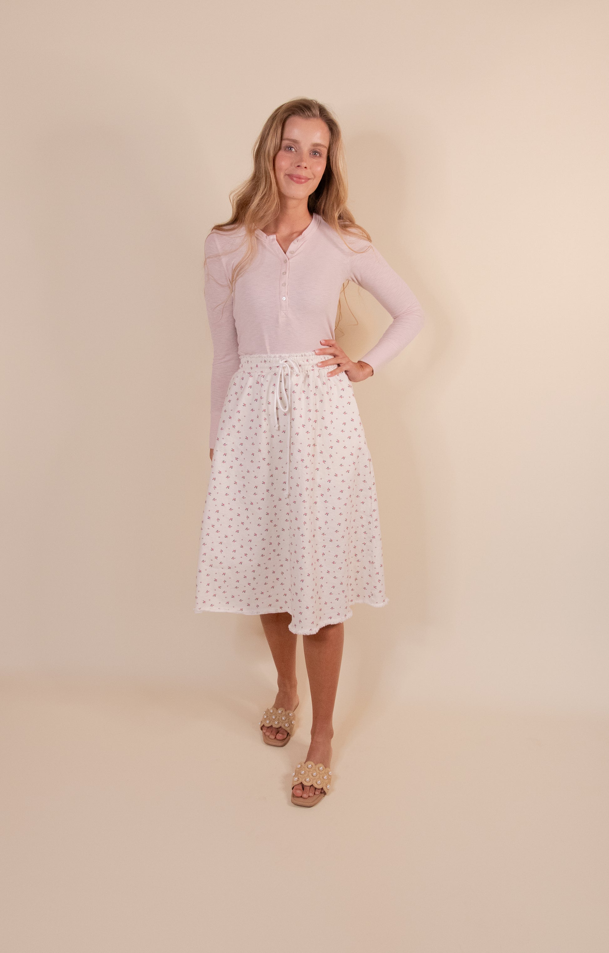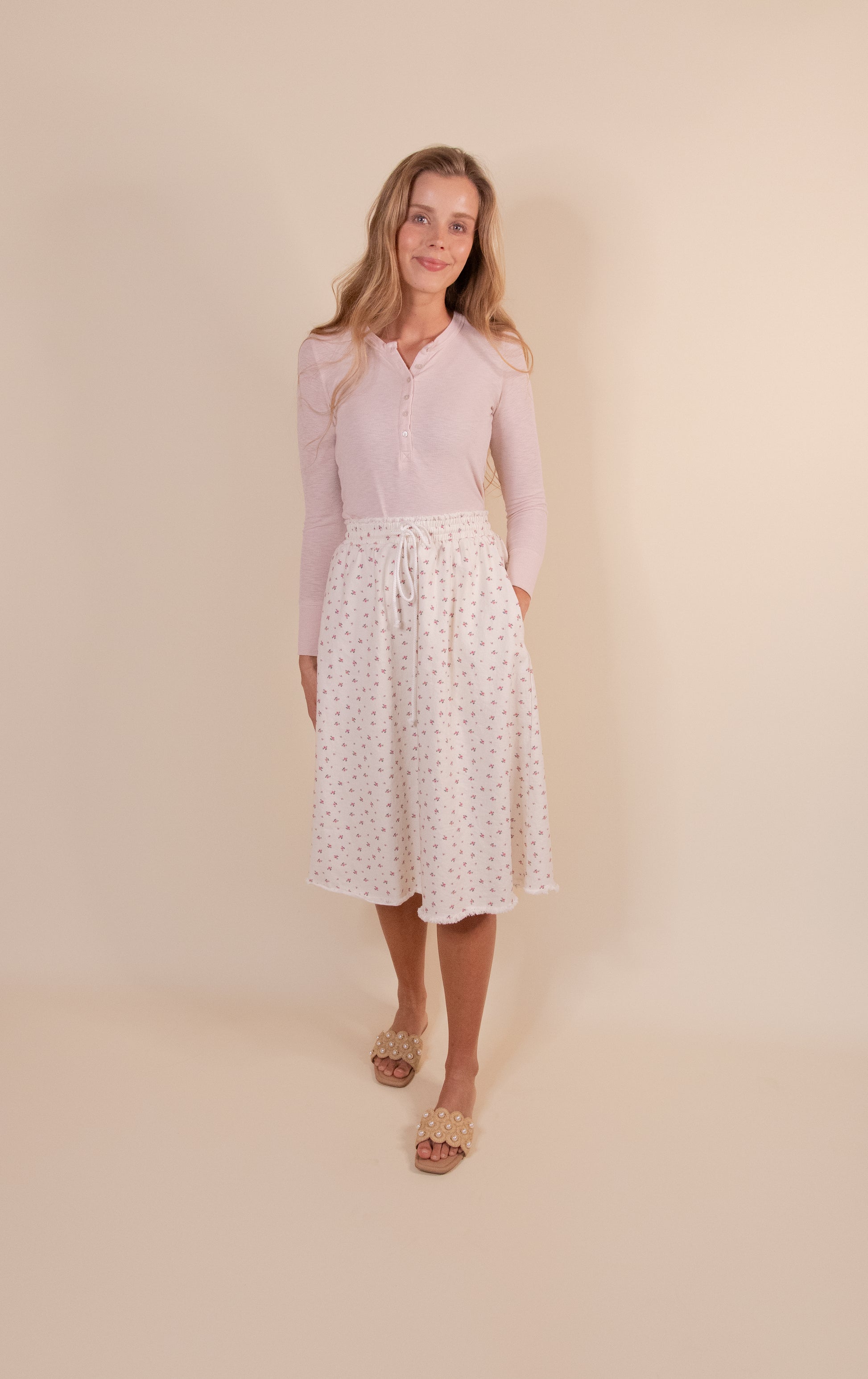 The Annie Denim Cream Floral Skirt combines comfort with effortless style. Crafted from stretch cotton blend fabric, this midi-length skirt features a relaxed fit with an elastic waistband and adjustable drawstring for a customized silhouette. Practical side pockets and inner mini lining provide functionality, while the frayed raw edge finish adds contemporary flair. The breathable 97% cotton, 3% spandex construction ensures all-day wearability. Available in sizes S-XL with a true-to-size fit.