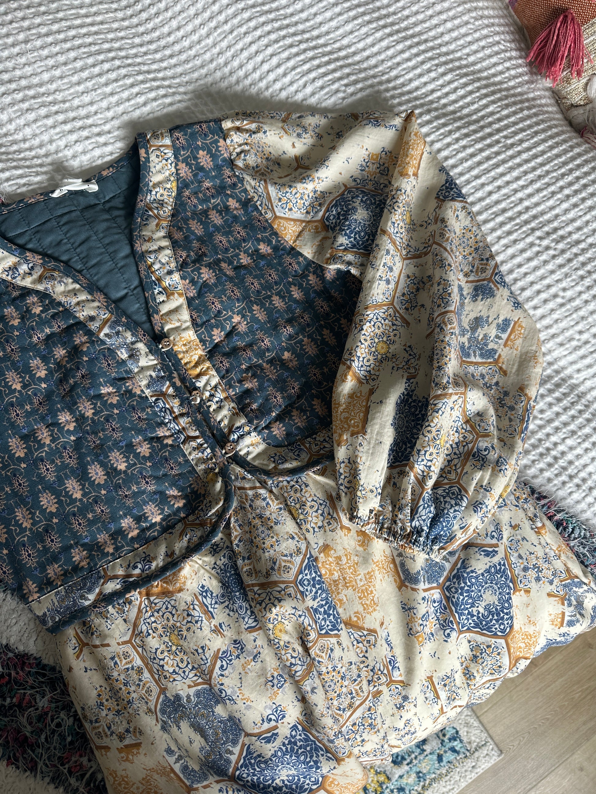 Make a statement with The Birdie Boho Vest Dress, where artistic flair meets everyday wearability. This midi dress showcases a captivating distressed floral mosaic print paired with a striking contrast quilted vest bodice that adds dimension and visual interest. The V neckline with faux button-down detailing creates a flattering silhouette, while long puff sleeves with elastic cuffs deliver effortless boho charm. Practical pockets keep your essentials close, and the hidden side zipper ensures a smooth, polished fit. Fully lined for comfort and confidence, this dress is perfect for those who embrace individuality and refuse to blend in.