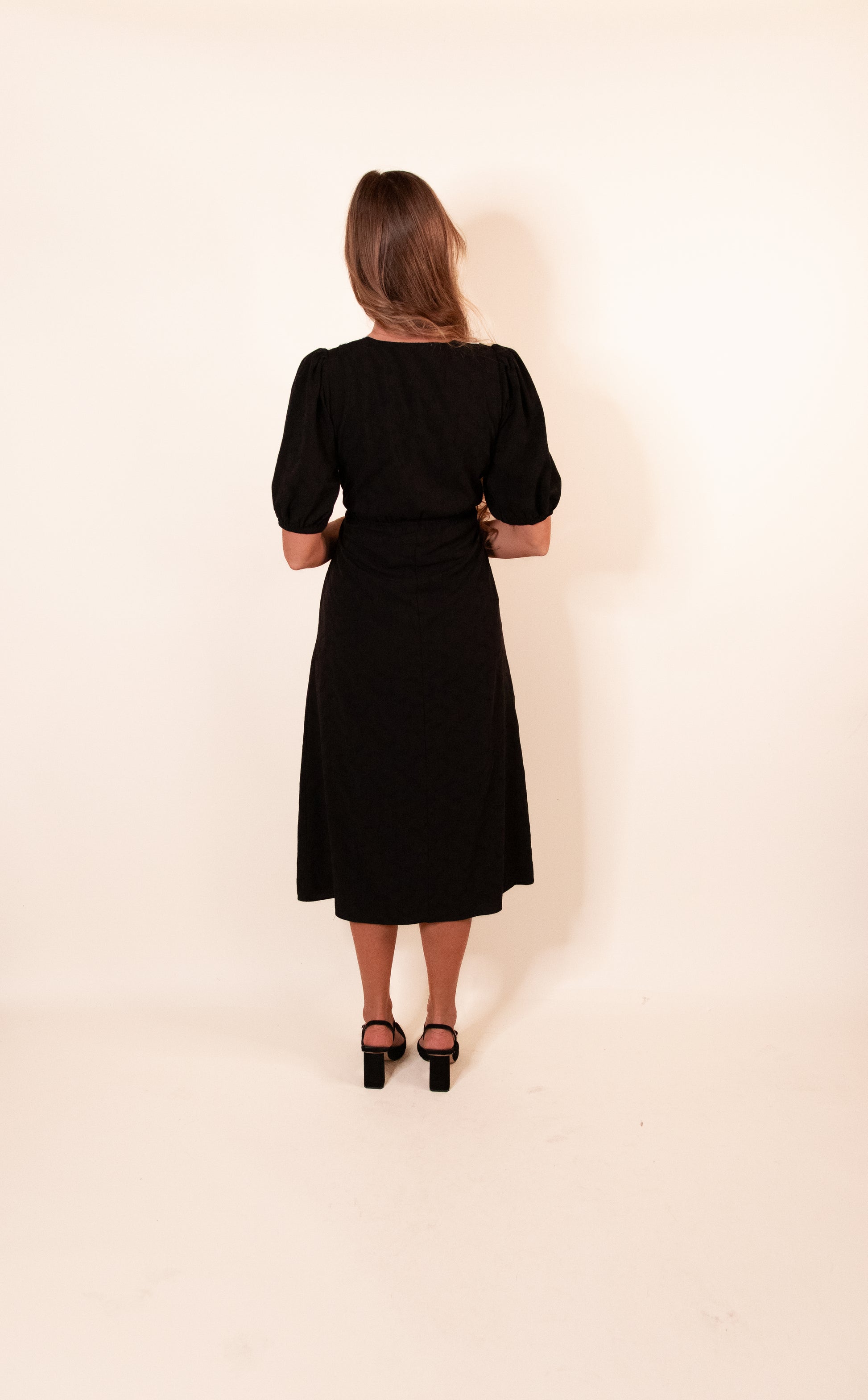 The Clara Lace Trim Dress combines timeless elegance with modern versatility. This jacquard woven midi dress features delicate elbow sleeves and a charming front tie detail that adds dimension to your silhouette. Finished with refined lace trim, it's the perfect piece for elevated everyday wear or special occasions. The midi length offers sophisticated coverage while the structured jacquard fabric ensures a polished, put-together look. Whether you're dressing up for brunch or heading to an evening event, this dress delivers effortless style and comfort.