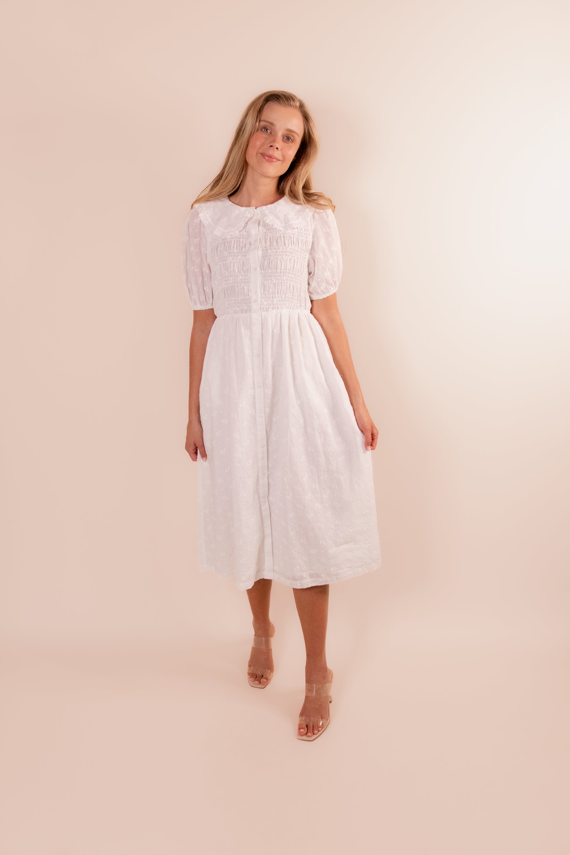 Elevate your wardrobe with the Lani Collar Eyelet Dress. Made from gorgeous white embroidered cotton, this dress boasts a feminine and girly oversized collar, smocked bodice for a flattering fit, and convenient pockets. Fully lined skirt portion featuring functioning buttons, this dress is both stylish and practical.