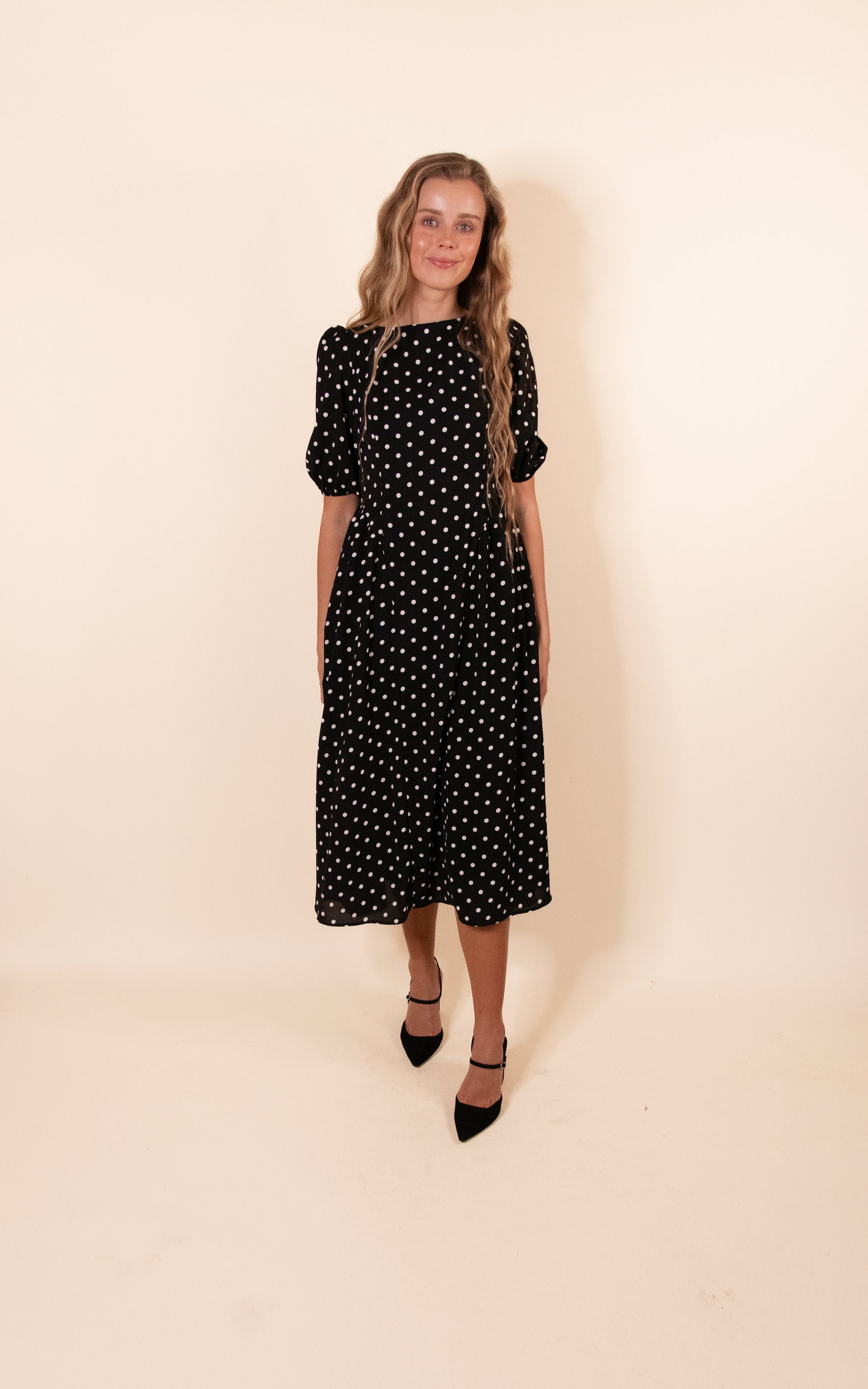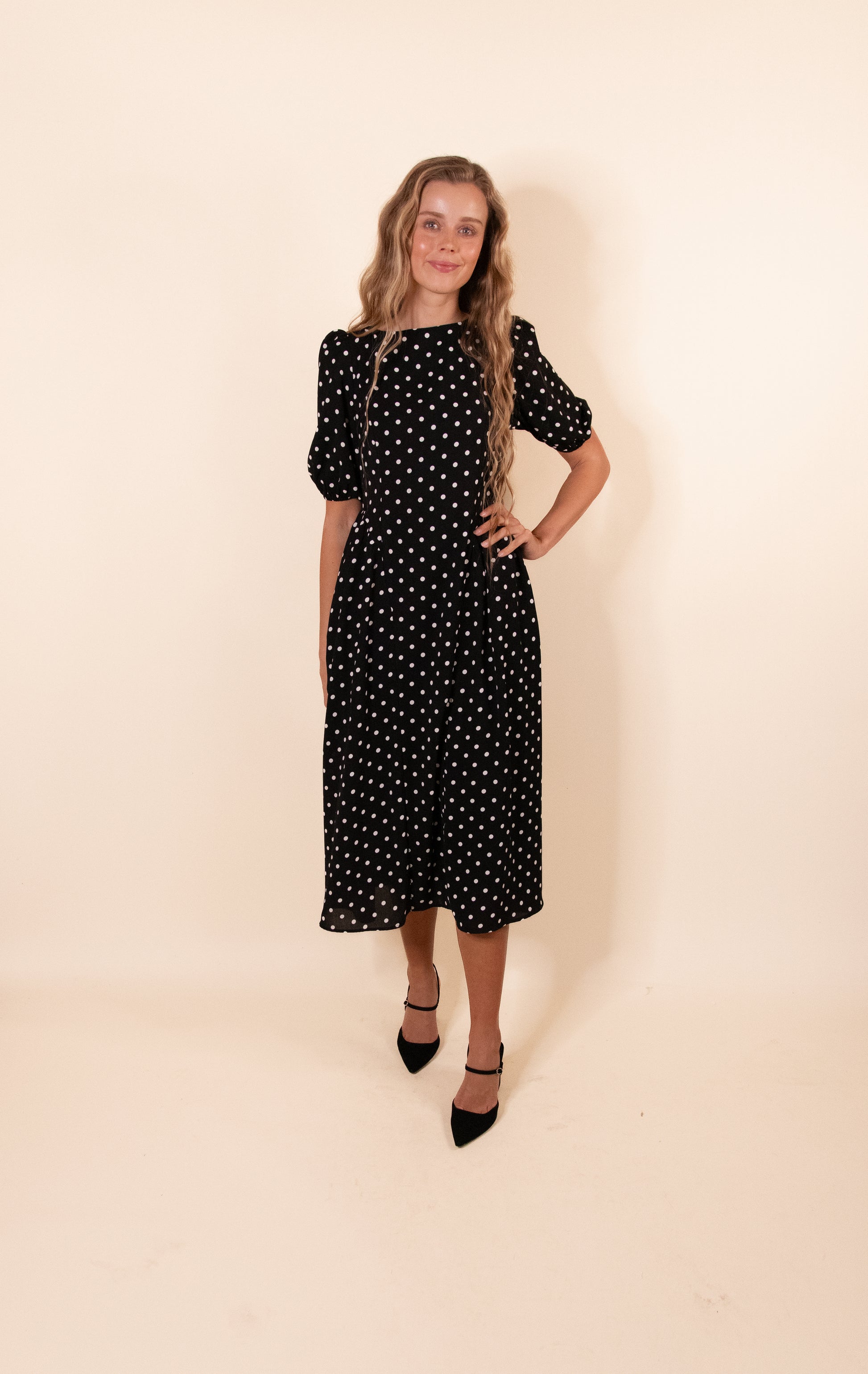 The Leah Polka Dot Dress brings timeless elegance to your everyday rotation. This classic black and white polka dot design features refined half sleeves and a sculpted waist seam that flatters your silhouette beautifully. Fully lined for comfort and confidence, this versatile piece transitions seamlessly from casual outings to more polished occasions. A wardrobe essential that never goes out of style, The Leah is the dress you'll reach for again and again.