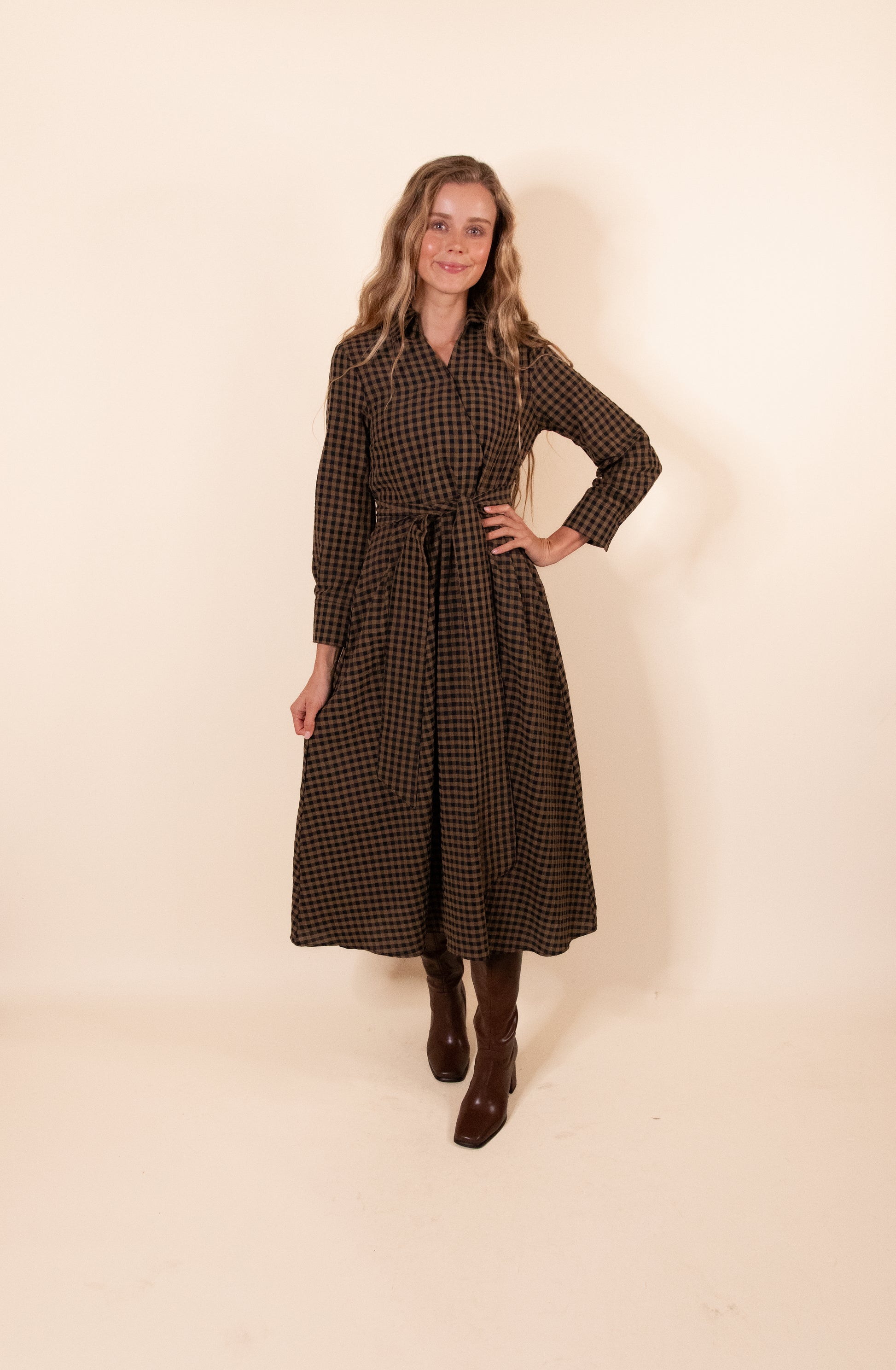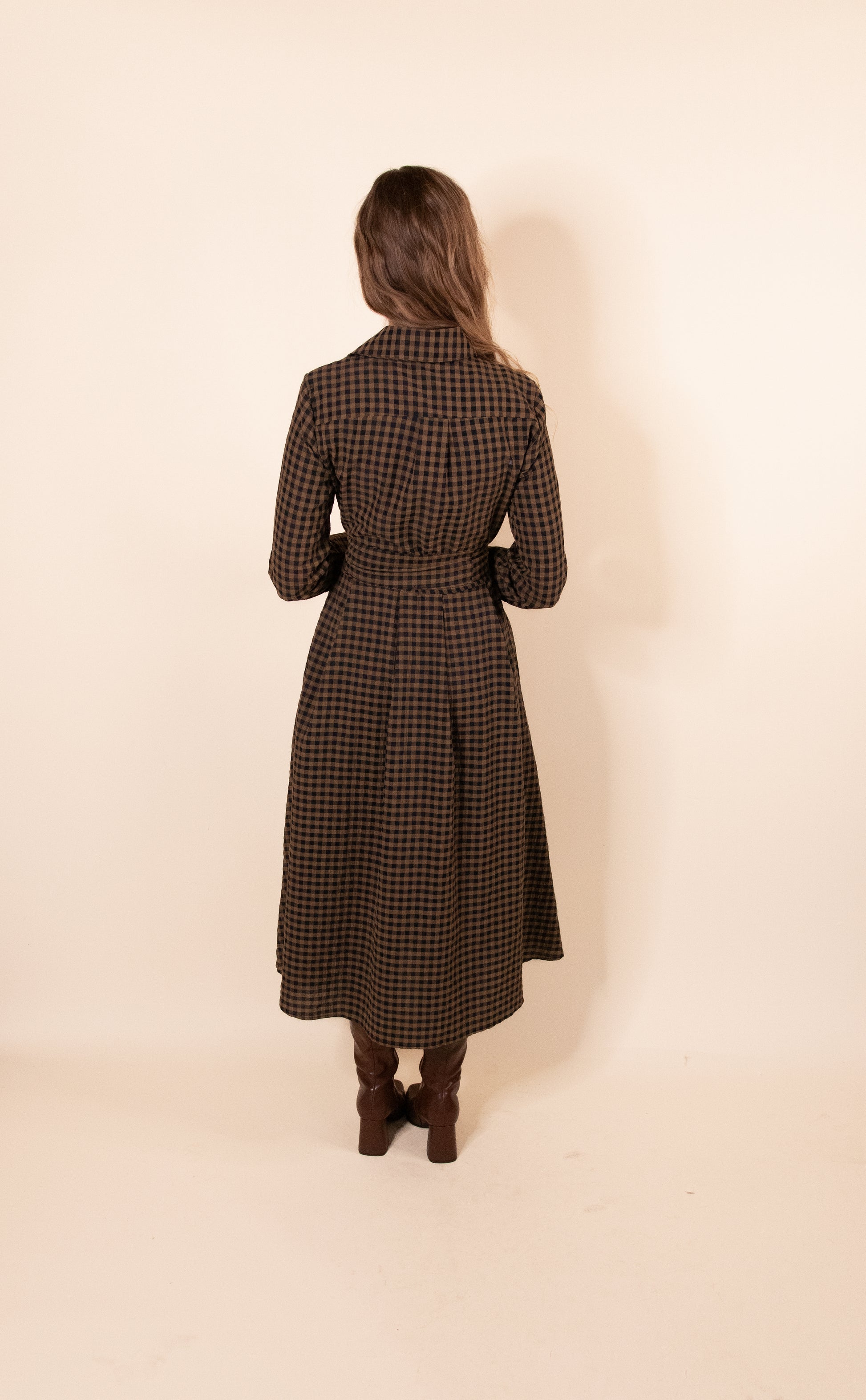 Elevate your everyday wardrobe with The Zoe Plaid Shirt Dress—a sophisticated midi that seamlessly transitions from office to evening. Featuring a sharp lapel collar and V-neckline, long sleeves with refined cuffs, and a flattering pleated waist, this dress delivers polished style with practical comfort. The asymmetric hem adds modern edge, while hidden side pockets keep your essentials close. Cinch the matching adjustable tie belt to customize your silhouette, and rely on the discreet side zipper for effortless dressing. Versatile, flattering, and undeniably chic.